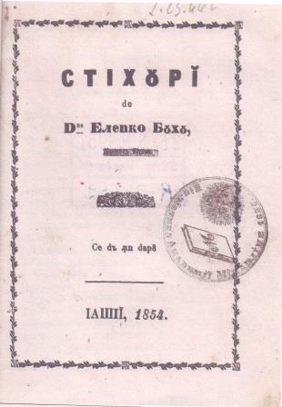 2 Stihuri de d-na Elenko Buhu, Se dă în dar, Iași, 1854. (În Moldova abia se deprinseseră cîteva litere latinești, așa că ediția e cu alfabet de tranziție). Mulțumiri doamnei Camelia Boca pentru ajutorul bibliografic.