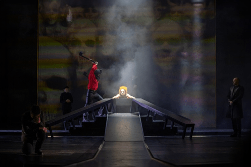 Asumîndu-și acum pe deplin maiestatea, ea va intra în scena finală înveșmîntată în rochia grea de brocart (costumele puternic caracterizante: Cristina Grămoșteanu), cu fața pudrată intens în alb și cu peruca roșcată, parcă aceeași cu cea a lui Mary: granița dintre regină și proscrisă este foarte subțire. De aceea locul execuției devine acum locul înălțării, al puterii regești, pentru care cele două s-au luptat pe viață și pe moarte, una cîștigînd viața, cealaltă plecînd în moarte. Această încleștare a reverberat puternic în sufletele noastre, confruntați cu bătălia acerbă pentru putere.