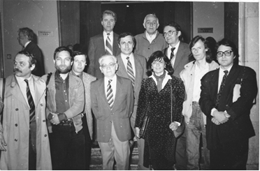 Conferința USR, București 1990 Marian Papahagi, Virgil Mihaiu, Adrian Popescu, Mircea Zaciu, Ion Pop, Costache Olăreanu, Ana Blandiana, Romulus Rusan, Aurel Dumitrașcu, Emil Hurezeanu. Foto: Ion Cucu
